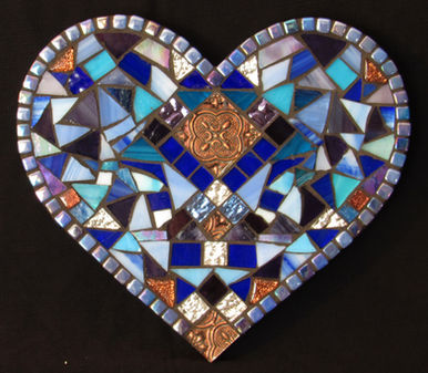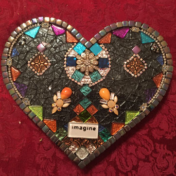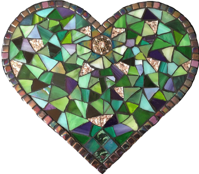 This series of hearts is an exploration of the interplay of color, using iridescent, opaque, and transparent glass, as well as beads and repurposed jewelry.